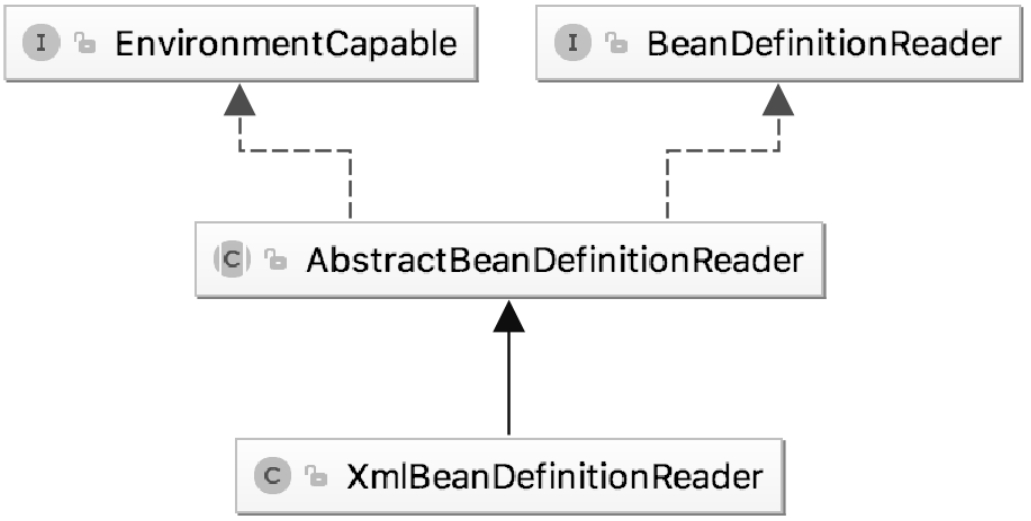 下面将对reader.loadBeanDefinitions(configLocations);这段代码进行分析。如图2-9所示,XmlBeanDefinitionReader是AbstractBeanDefinitionReader的子类,所以reader.loadBeanDefinitions(configLocations)会调用其父类的方法loadBeanDefinitions。