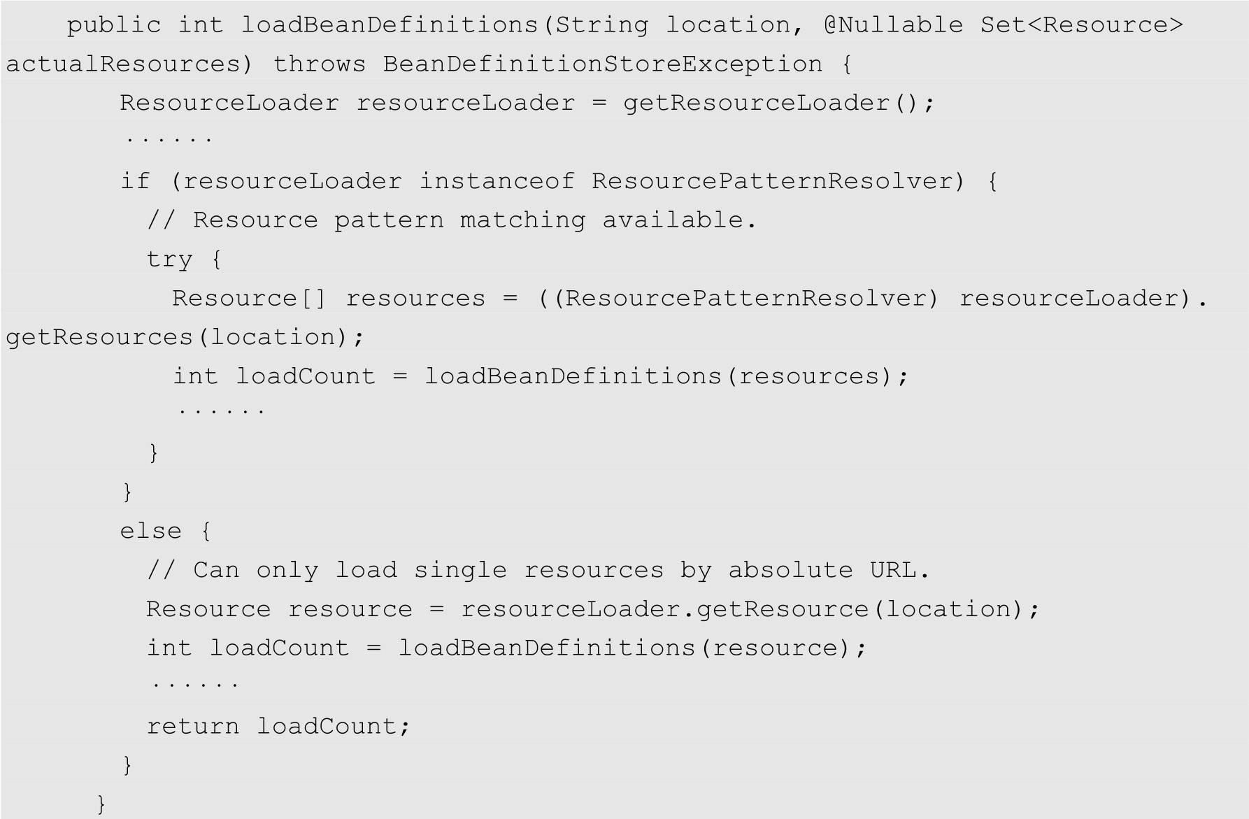 可以发现loadBeanDefinitions(String... locations)方法会遍历资源数组,最终会调用重载方法loadBeanDefinitions(String location, @Nullable Set<Resource> actualResources),重载方法的部分实现代码如下: