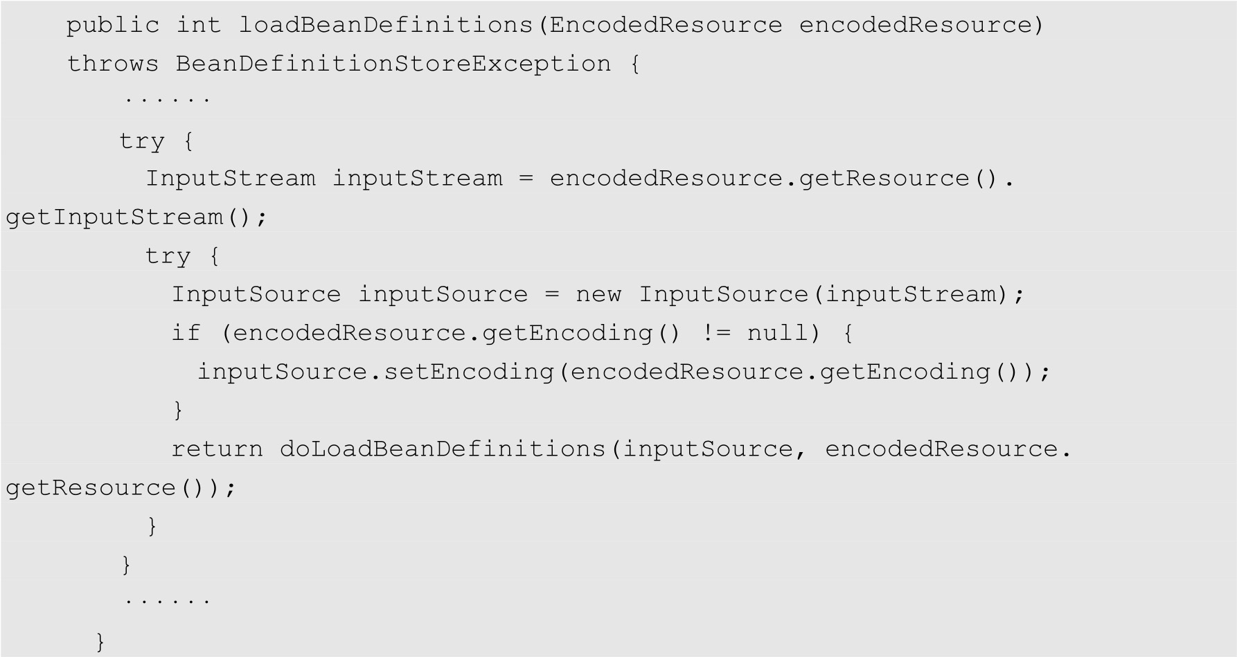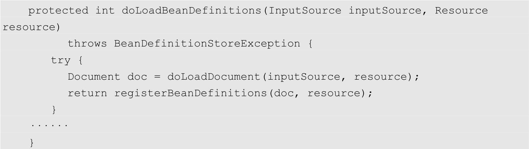 loadBeanDefinitions(EncodedResource encodedResource)方法以流的方式读取资源文件,调用doLoadBeanDefinitions()方法。doLoadBeanDefinitions()是载入定义Bean的核心方法。进入doLoadBeanDefinitions()方法,查看其部分代码如下: