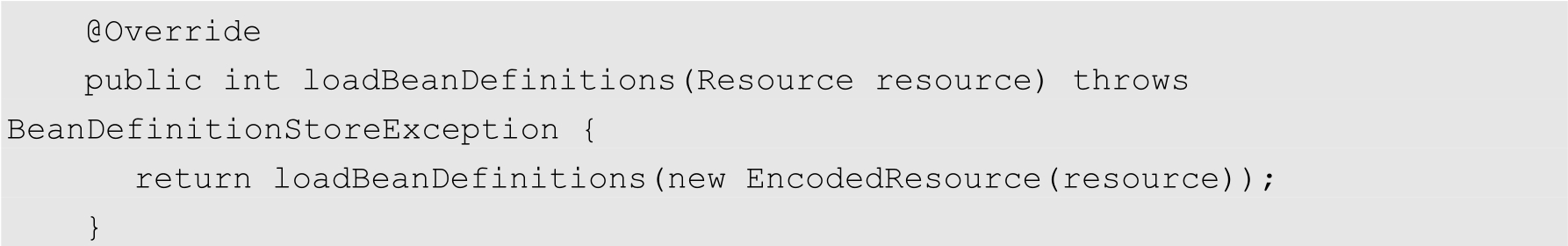 该方法实现会调用重载方法loadBeanDefinitions(EncodedResource encodedResource)。因该重载方法很长,现截取部分代码如下: