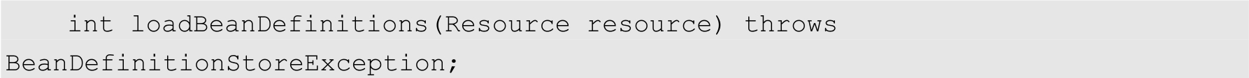 loadBeanDefinitions内部工作原理是遍历每个资源,依次调用loadBeanDefinitions(Resource resource)重载的方法。该重载的方法定义在顶层接口BeanDefinitionReader中,其方法定义如下: