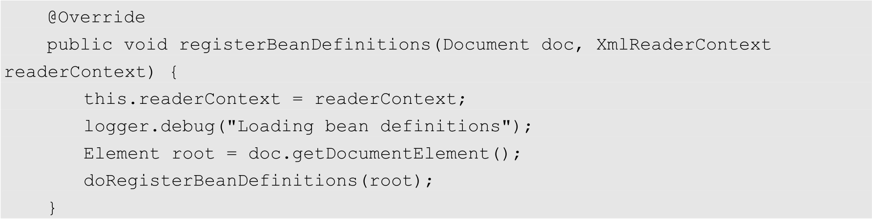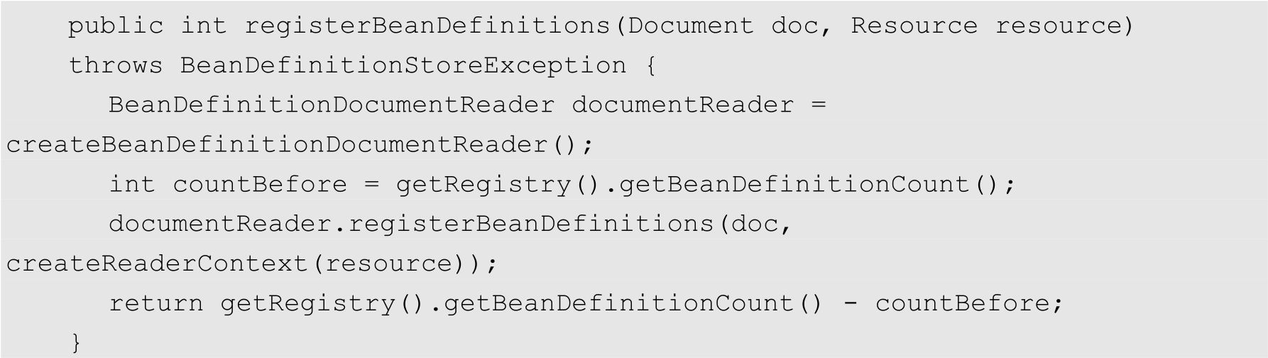 从doLoadBeanDefinitions(InputSource inputSource, Resource resource)方法的定义可以看出,最终注册Bean的地方是在registerBeanDefinitions(doc, resource);这一行代码。进入registerBeanDefinitions(doc, resource)方法,查看其代码如下: