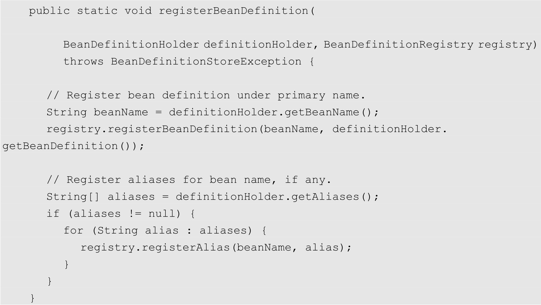 从processBeanDefinition(Element ele, BeanDefinitionParserDelegate delegate)方法的代码可知,最关键的是BeanDefinitionReaderUtils.registerBeanDefinition(bdHolder,getReaderContext().getRegistry());的调用。这是注册Bean的关键代码,查看其代码如下: