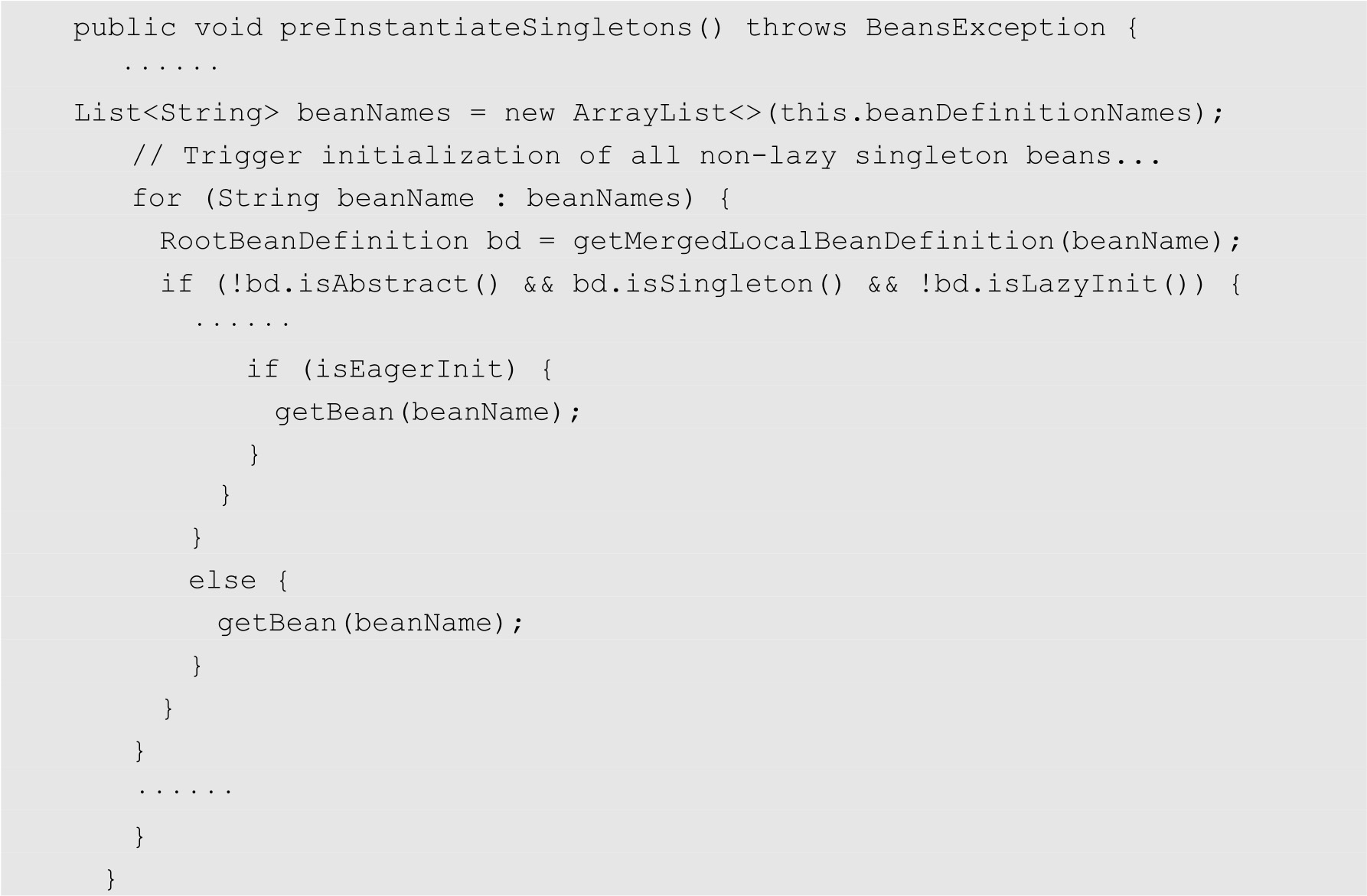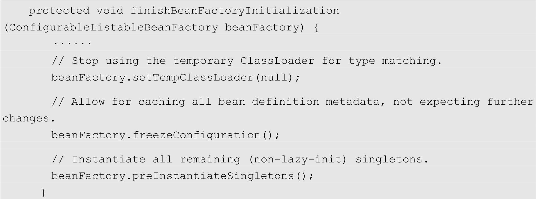 首先进入finishBeanFactoryInitialization(ConfigurableListableBeanFactory beanFactory)方法,查看其部分代码如下: