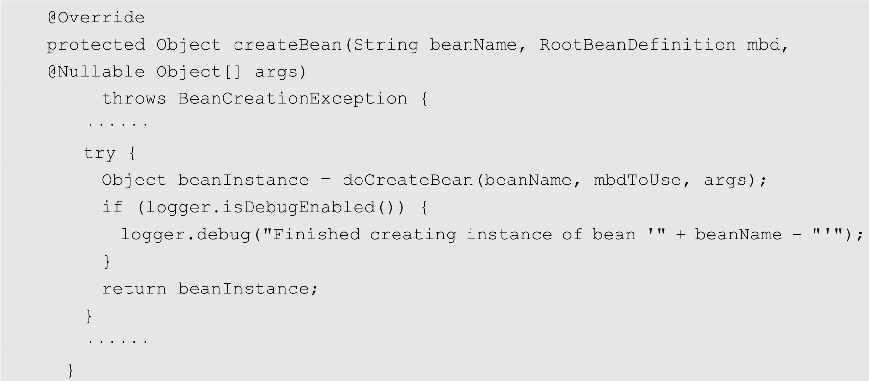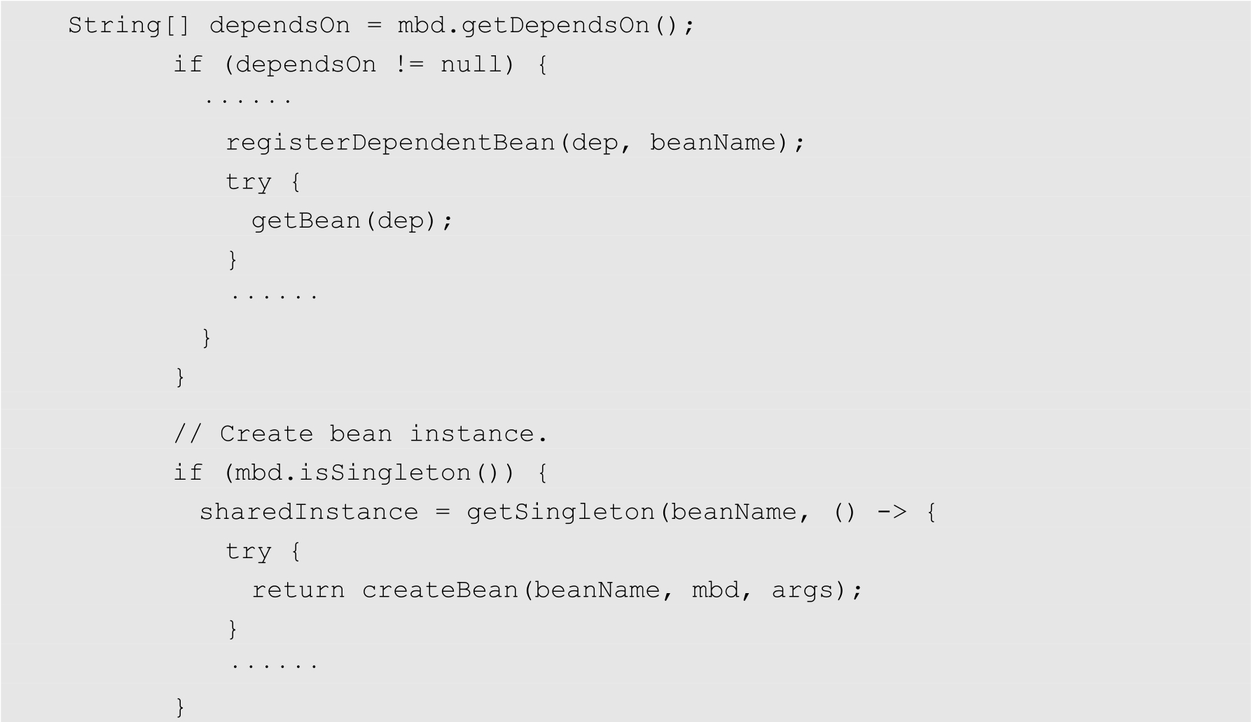 可以看到,该方法首先会获取当前Bean依赖关系mbd.getDependsOn();接着根据依赖的BeanName递归调用getBean()方法,直到调用getSingleton()方法返回依赖Bean,即当前正在创建的Bean,不断探寻依赖其的Bean,直到依赖关系最底层的Bean没有依赖的对象了,至此整个递归过程结束。getSingleton()方法的参数是createBean()方法返回值。createBean()是在AbstractAutowireCapableBeanFactory中实现的。createBean(String beanName, RootBeanDefinition mbd, @Nullable Object[] args)方法部分代码如下: