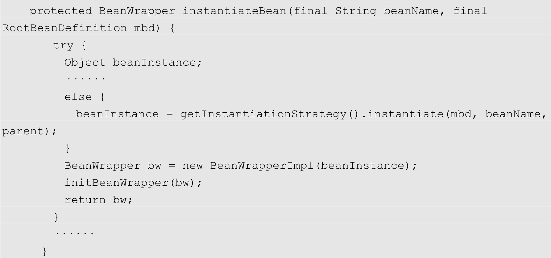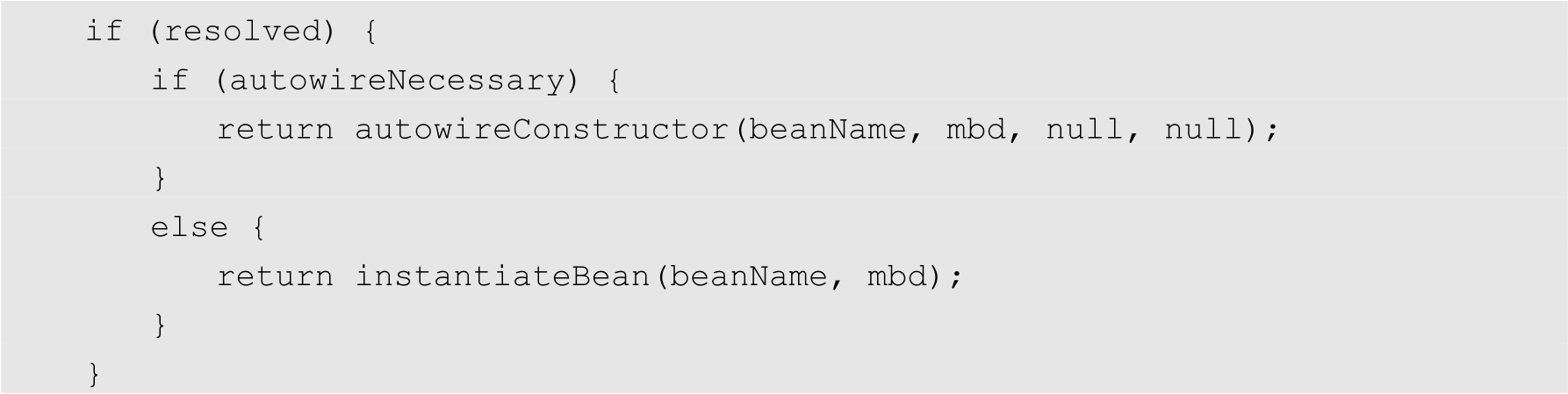 先看方法createBeanInstance(String beanName, RootBeanDefinition mbd, @Nullable Object[]args),其核心实现如下: