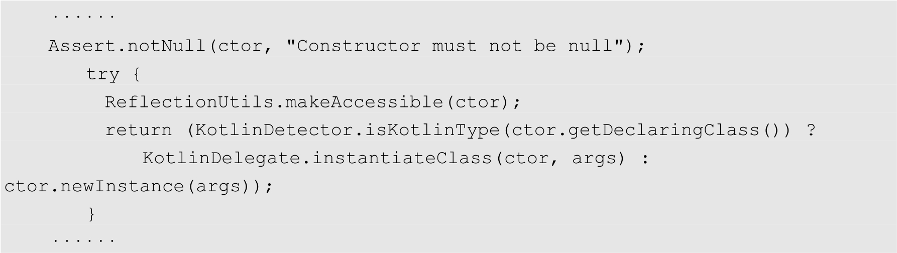 该方法会判断是否是Kotlin类型。如果不是Kotlin类型,则调用Constructor的newInstance方法,也就是最终使用反射创建了该实例。