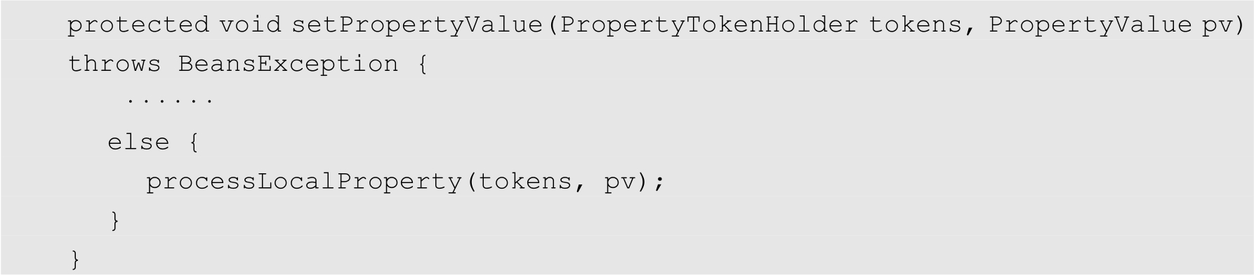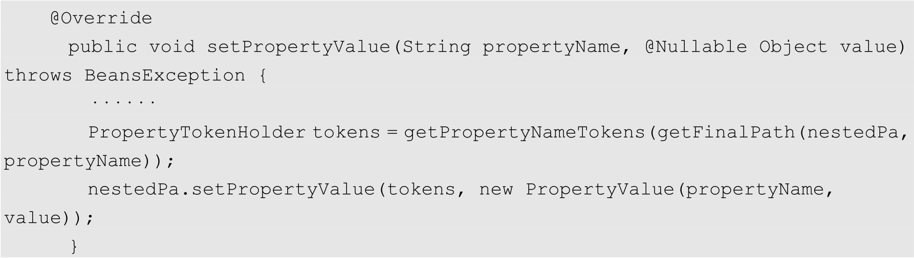 其核心是最后一行nestedPa.setPropertyValue(tokens, new PropertyValue(propertyName, value))代码,进入setPropertyValue方法查看其部分实现如下: