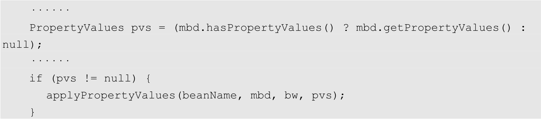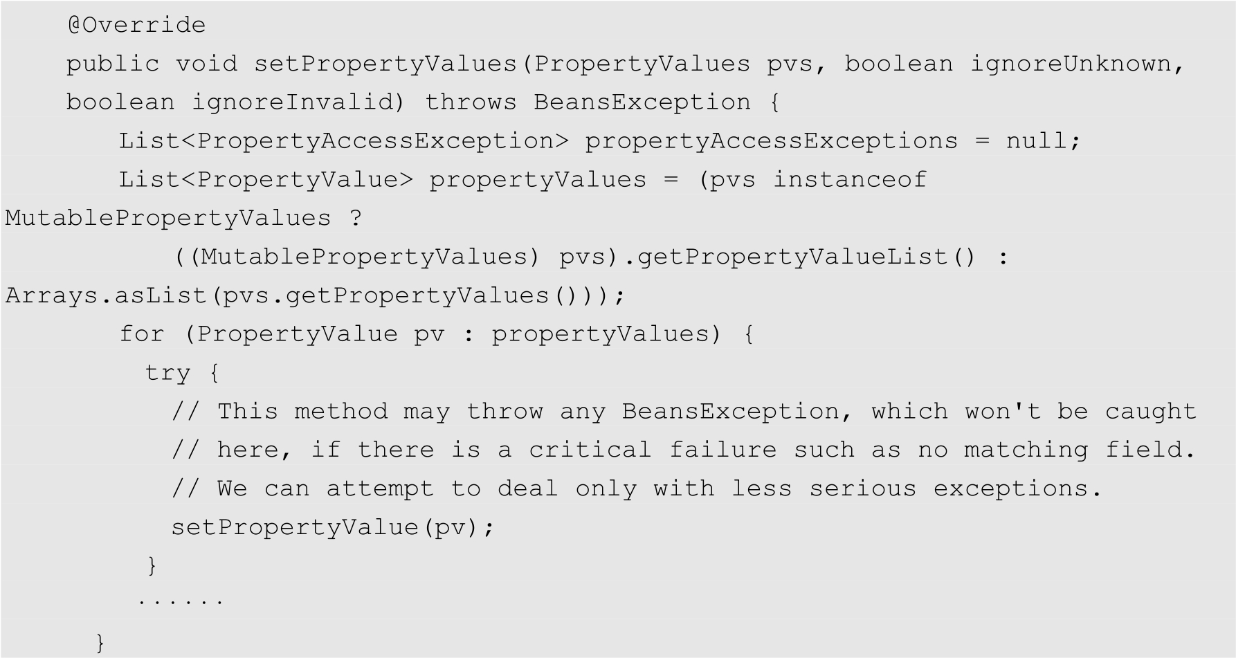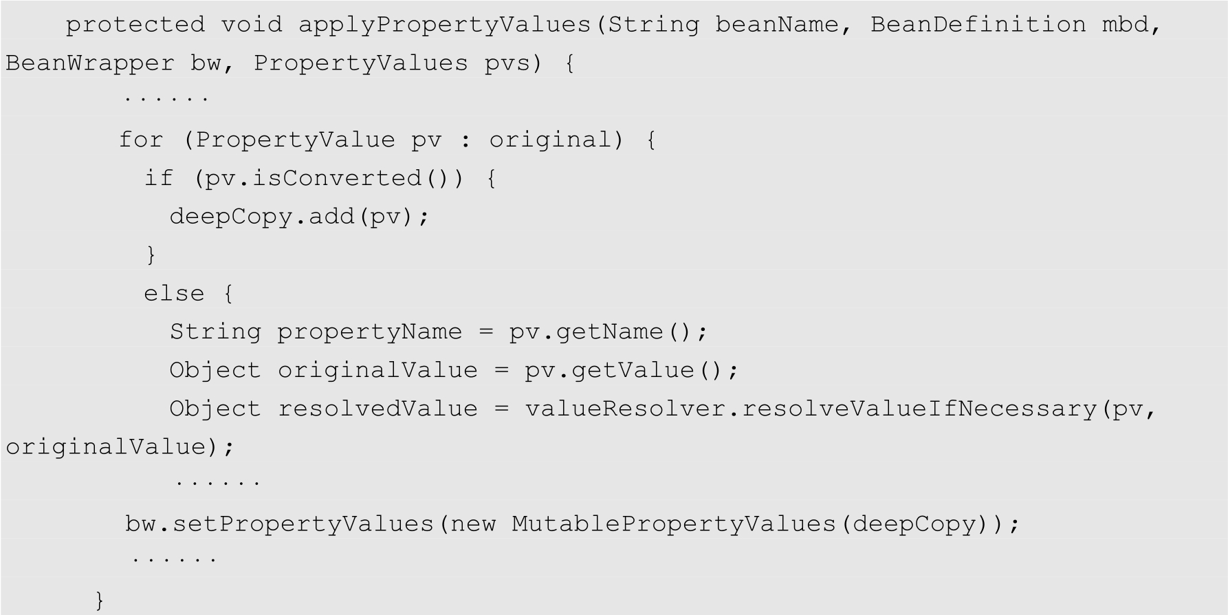 这里将会发生递归调用,根据依赖的名称,从BeanFactory中递归得到依赖。到这段结束,就可以获取到依赖的Bean。回到applyPropertyValues入口处,获取到依赖的对象值后,将会调用bw.setPropertyValues(new MutablePropertyValues(deepCopy))方法,这是将依赖值注入的地方。此方法会调用AbstractPropertyAccessor类的setPropertyValues方法,查看AbstractPropertyAccessor.setPropertyValues方法的实现,其部分代码如下: