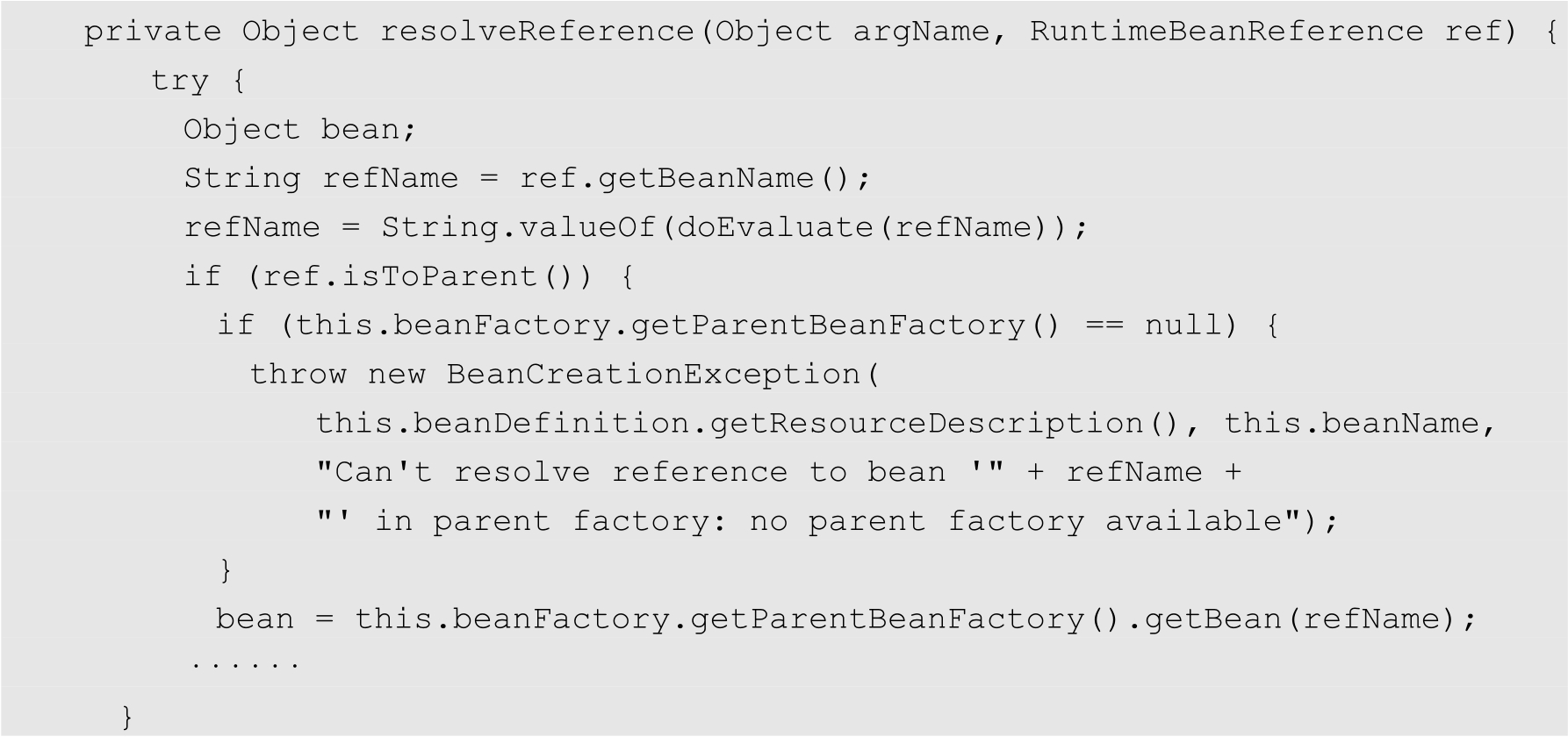 resolveValueIfNecessary(Object argName, @Nullable Object value)方法的核心是resolveReference(argName, ref),该方法是解决Bean依赖关系的。进入该方法的代码,查看其部分实现如下: