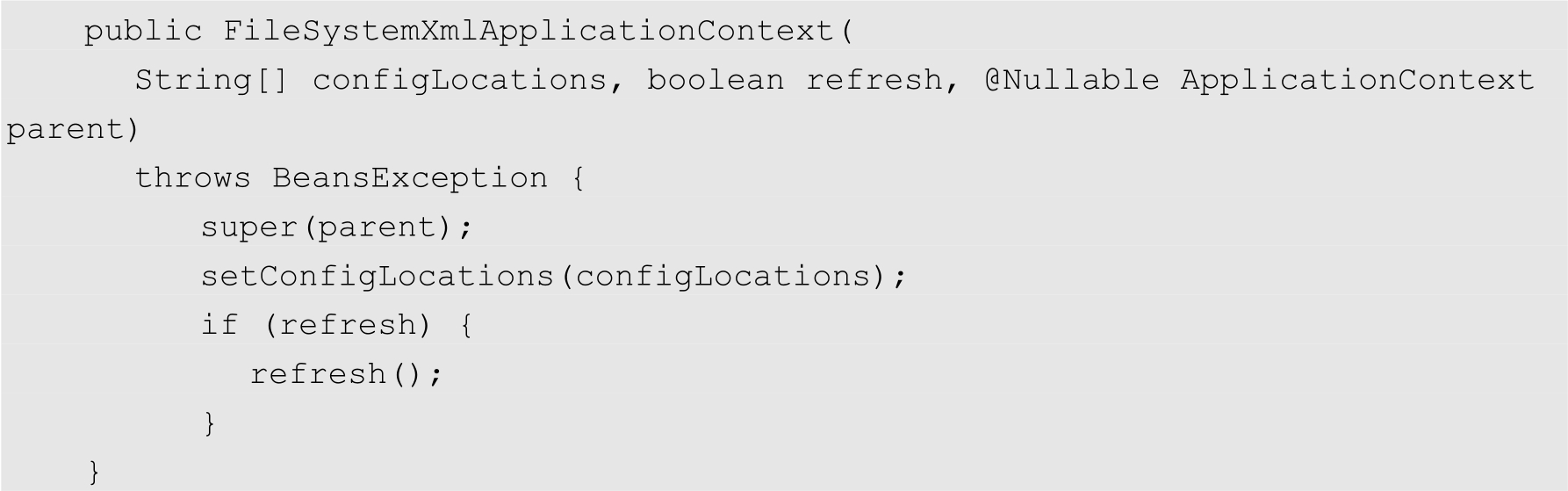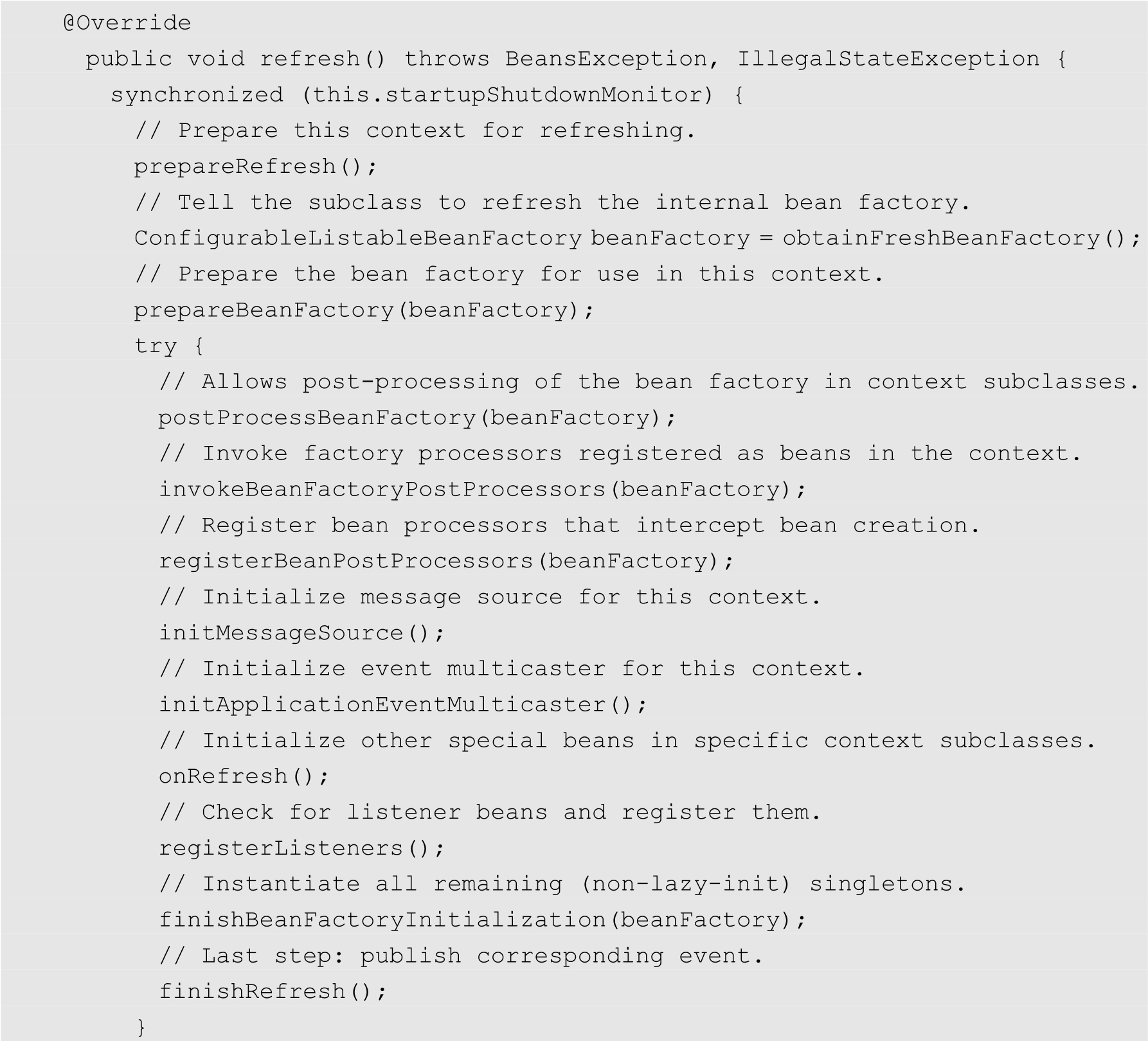 AbstractApplicationContext类实现了ConfigurableApplicationContext接口,重写了refresh()方法。下面将分析FileSystemXmlApplicationContext类的超类AbstractApplicationContext中的refresh()方法,由于方法很长,只截取了部分重要代码: