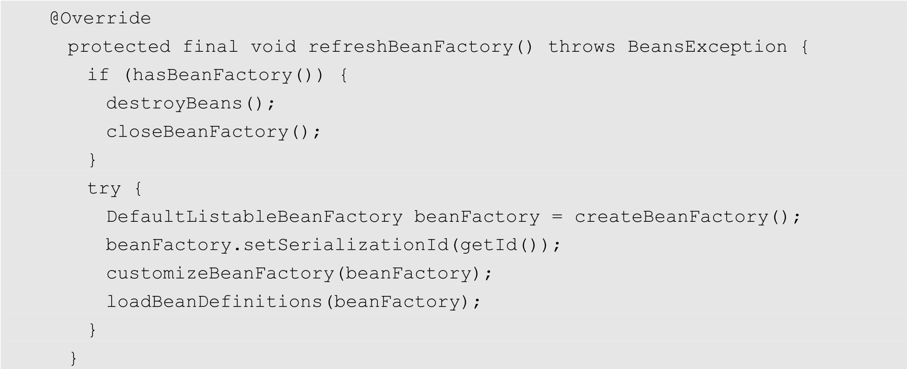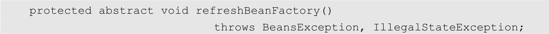 这两步骤中刷新BeanFactory的方法refreshBeanFactory()是核心,接下来进一步分析refreshBeanFactory()方法。其方法定义如下: