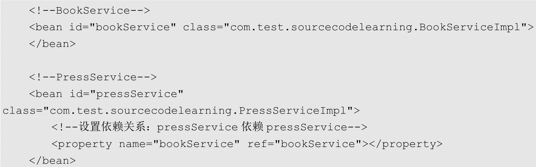 本例用一个最简单最基础的通过XML配置的方式,阐述IoC容器的启动过程,PressServiceImpl和BookServiceImpl两者依赖关系配置如下: