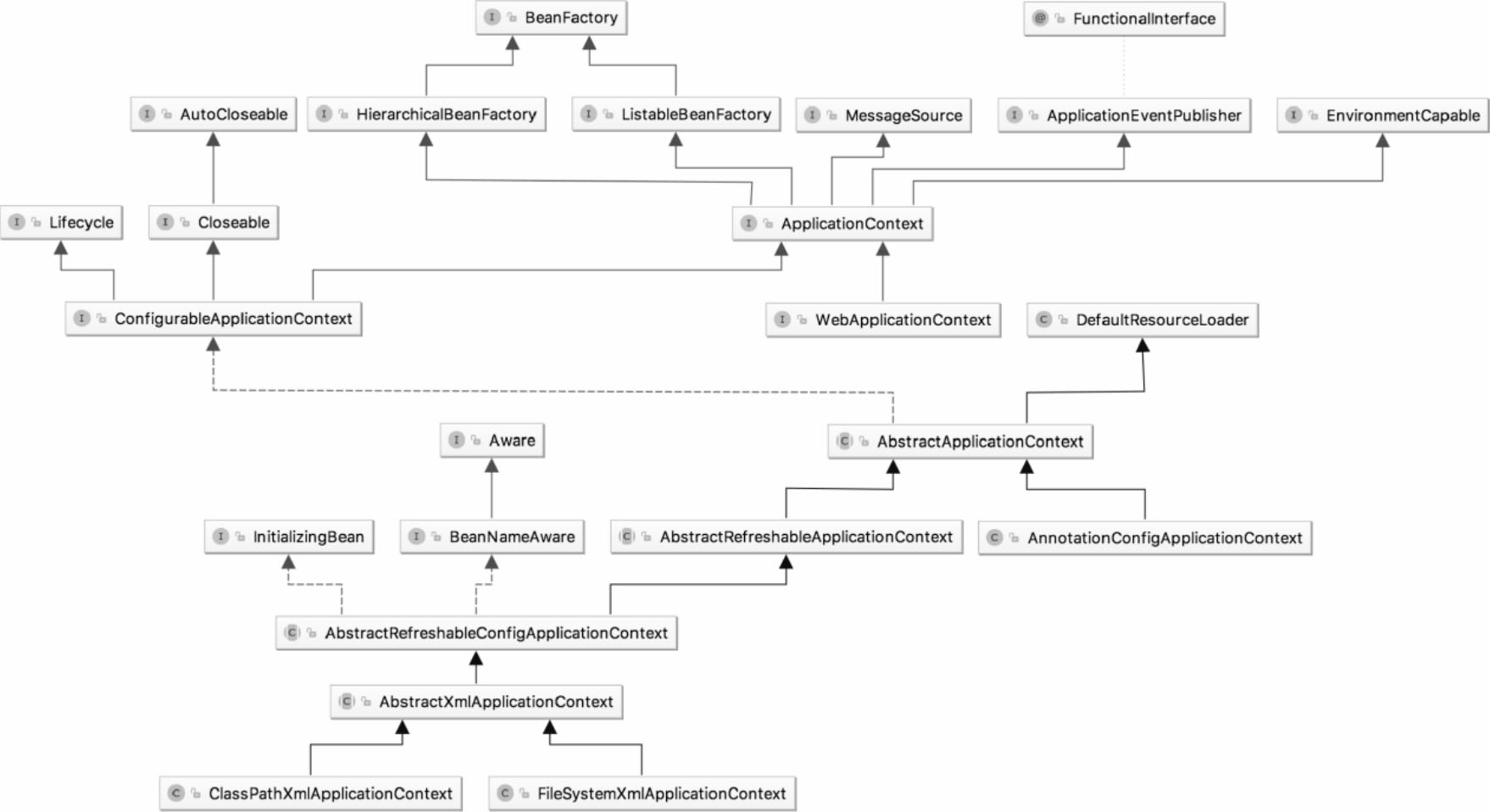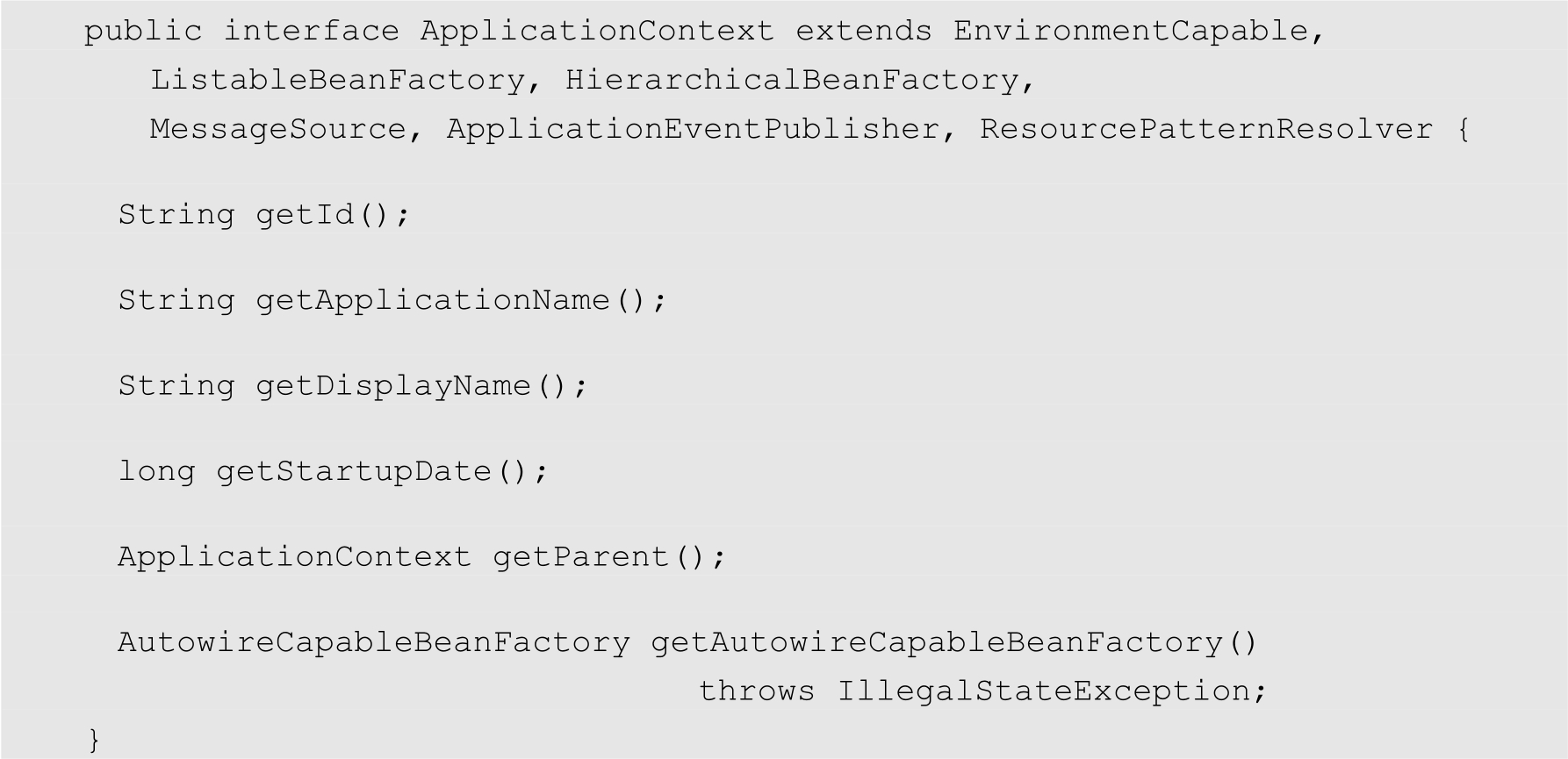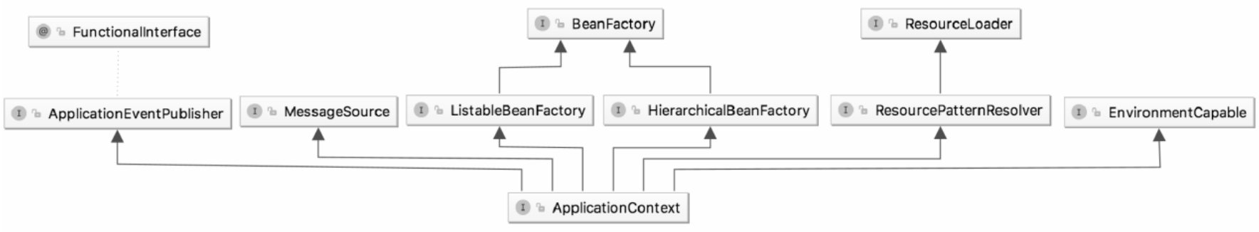 从图2-7可以看到,ListableBeanFactory和HierarchicalBeanFactory这两个接口都继承了BeanFactory,ApplicationContext则继承了这两个接口,可以证明ApplicationContext接口是扩展了BeanFactory接口的。