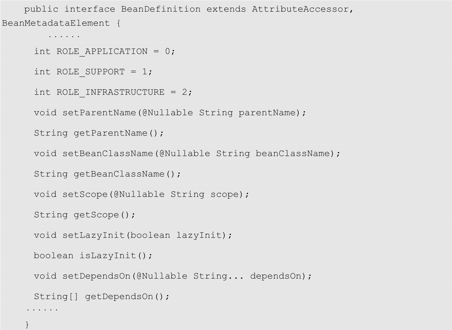 由于BeanDefinition代码比较长,限于篇幅,此处只截取部分代码如下: