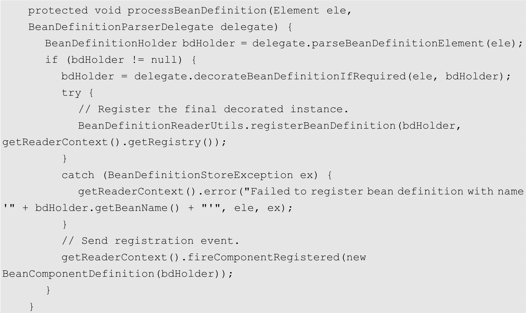 根据不同bean的配置不同,进入不同分支执行。本书的示例是进入processBeanDefinition(ele,delegate)方法,下面进入processBeanDefinition(Element ele, BeanDefinitionParserDelegate delegate)方法,查看其实现如下: