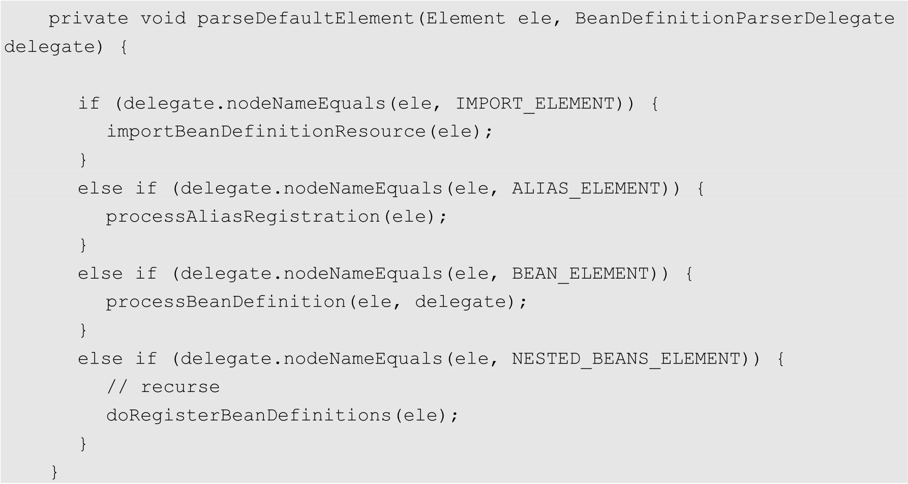 parseBeanDefinitions(Element root, BeanDefinitionParserDelegate delegate)方法的核心逻辑是依赖parseDefaultElement(ele, delegate);方法实现的,进入parseDefaultElement(Element ele,BeanDefinitionParserDelegate delegate)方法的代码,查看其代码如下: