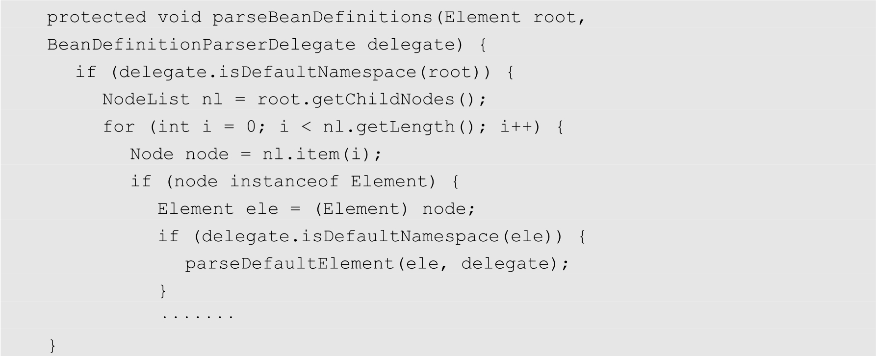 doRegisterBeanDefinitions(Element root)方法的核心逻辑在parseBeanDefinitions(root,this.delegate);这个方法中处理。进入parseBeanDefinitions(Element root, BeanDefinitionParserDelegate delegate)方法的代码,查看其方法部分实现如下: