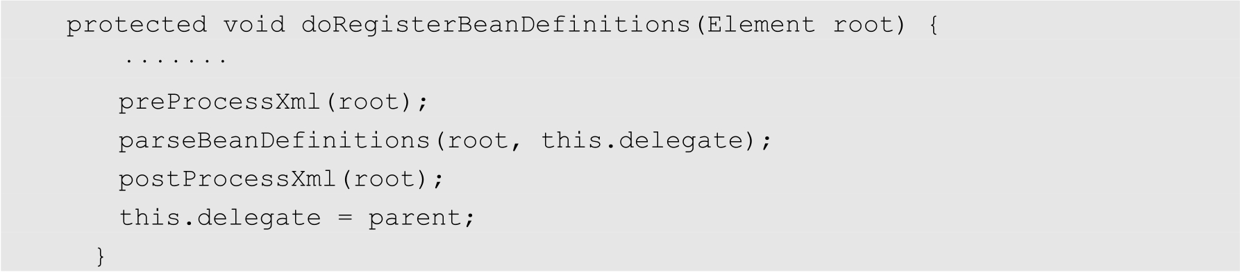 registerBeanDefinitions(Document doc, XmlReaderContext readerContext)方法是在DefaultBeanDefinitionDocumentReader中实现的。核心是通过doRegisterBeanDefinitions()方法实现的。进入doRegisterBeanDefinitions(Element root)方法的代码,查看其部分实现代码如下: