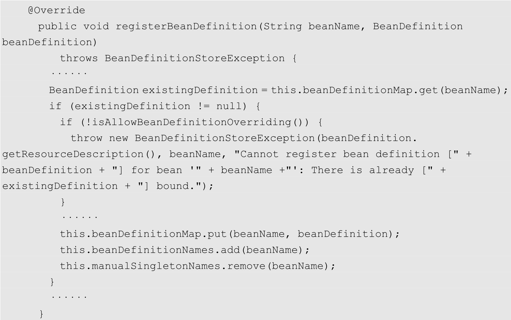 本例将进入BeanDefinitionRegistry接口的实现类DefaultListableBeanFactory中,查看该方法,部分实现代码如下: