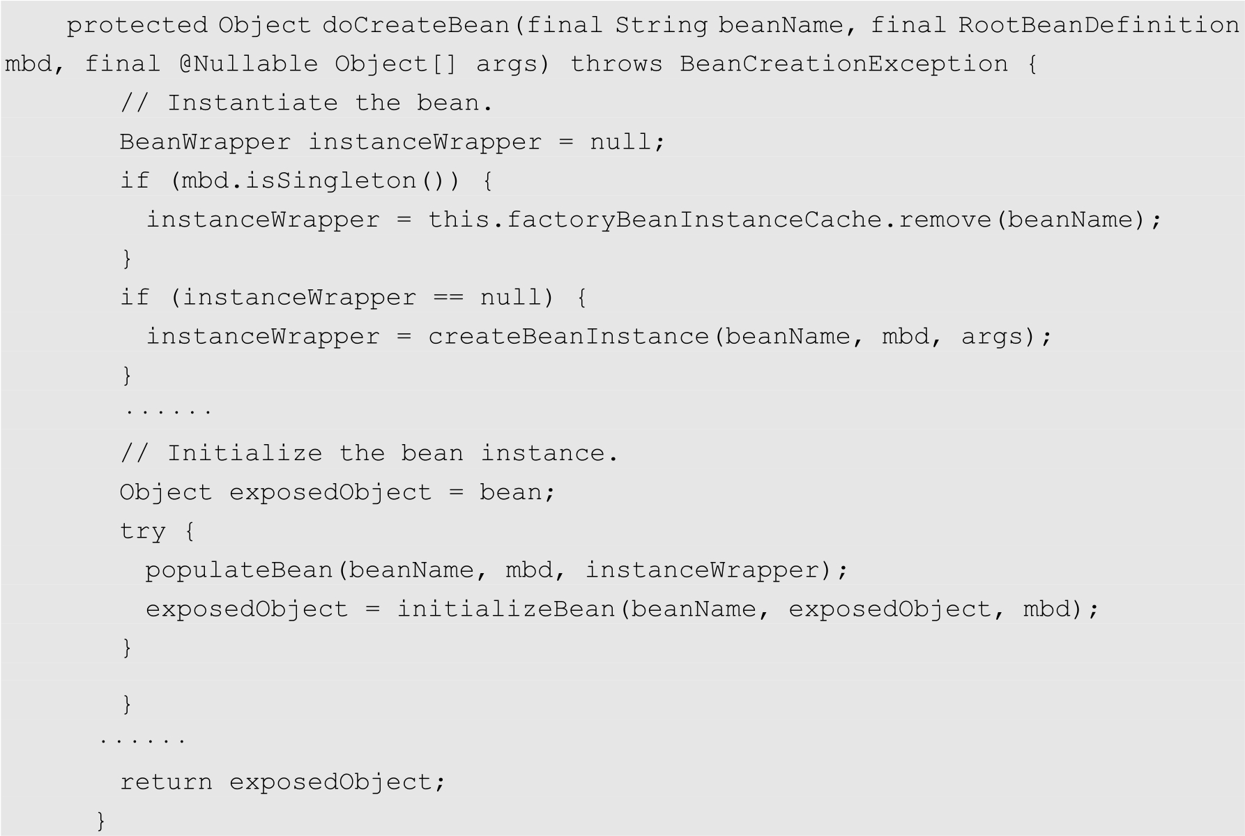 createBean(String beanName, RootBeanDefinition mbd, @Nullable Object[] args)方法的核心是doCreateBean(beanName, mbdToUse, args)这个方法,doCreateBean将会返回Bean对象的实例。查看doCreateBean的部分代码如下: