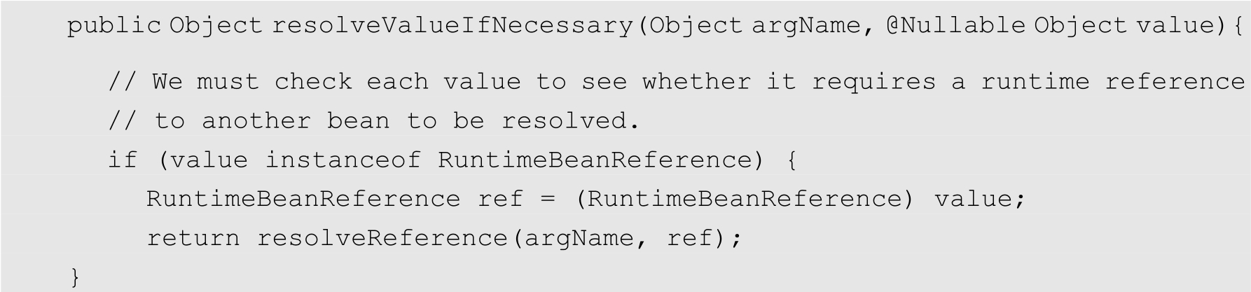 关键代码Object resolvedValue = valueResolver.resolveValueIfNecessary(pv, originalValue);该方法是获取property对应的值。resolveValueIfNecessary(pv, originalValue)方法部分代码如下: