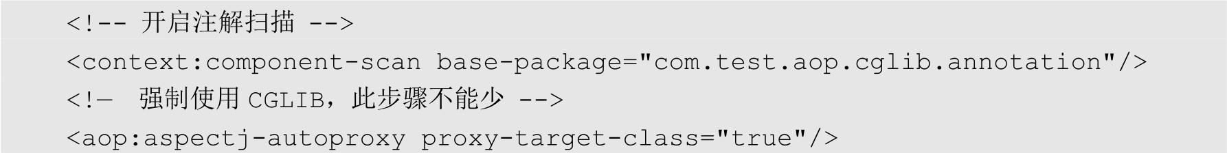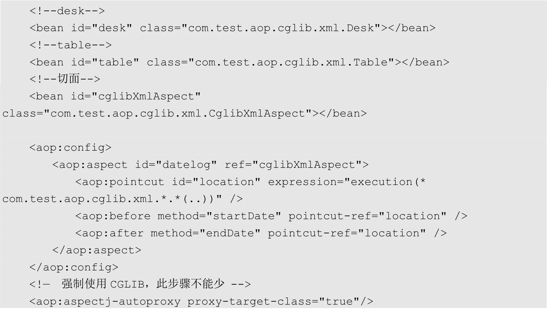 配置文件修改为spring-chapter3-annotationcglibaop.xml中不再需要单独定义的Bean和切面,只需要很少的配置:
