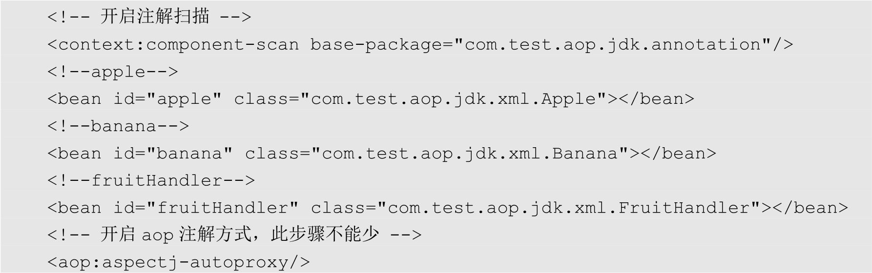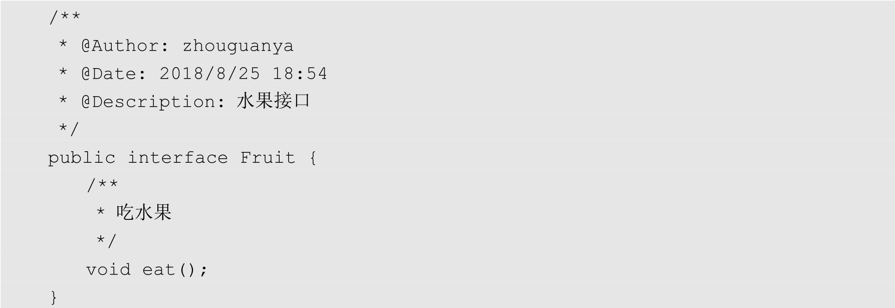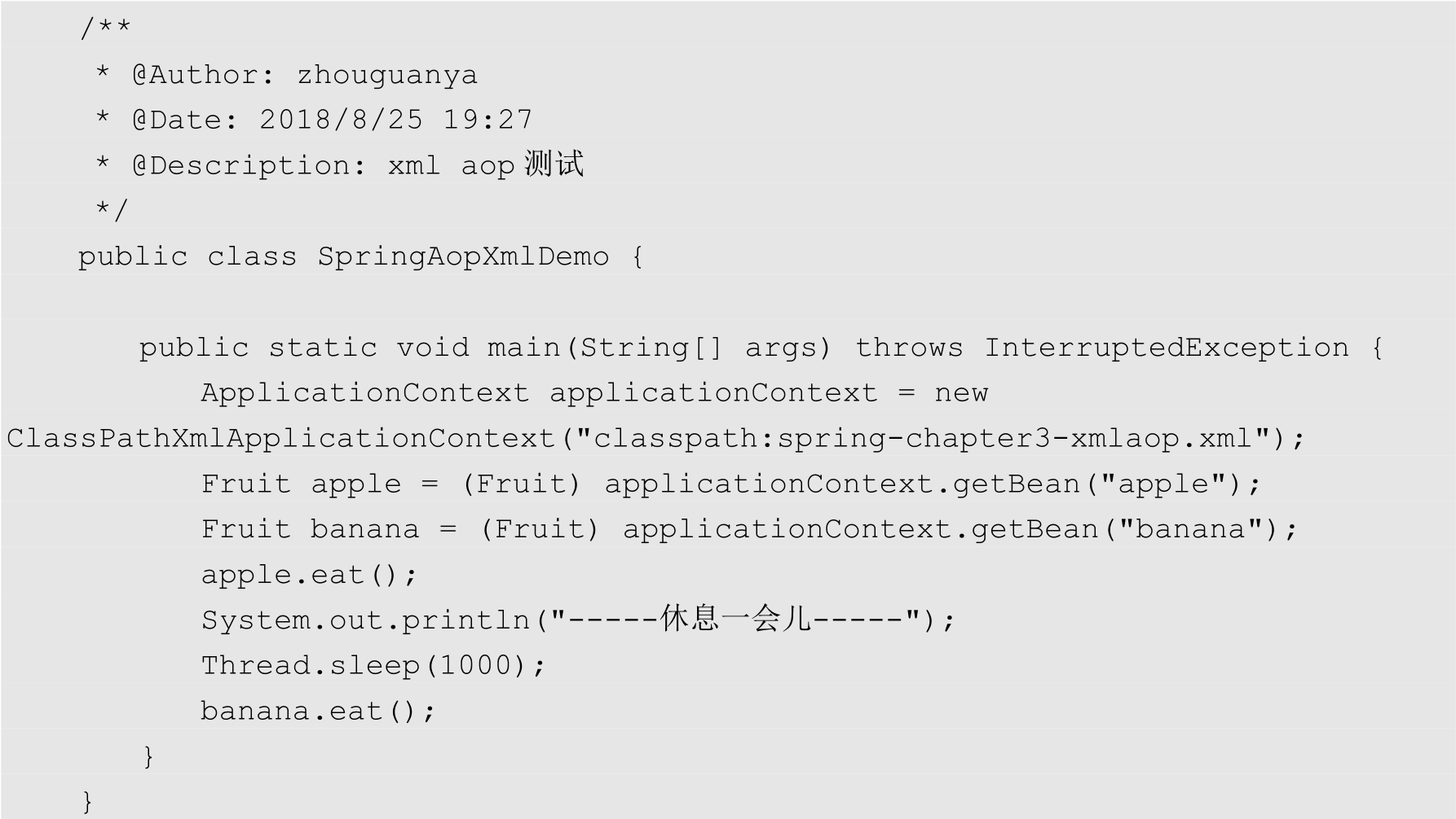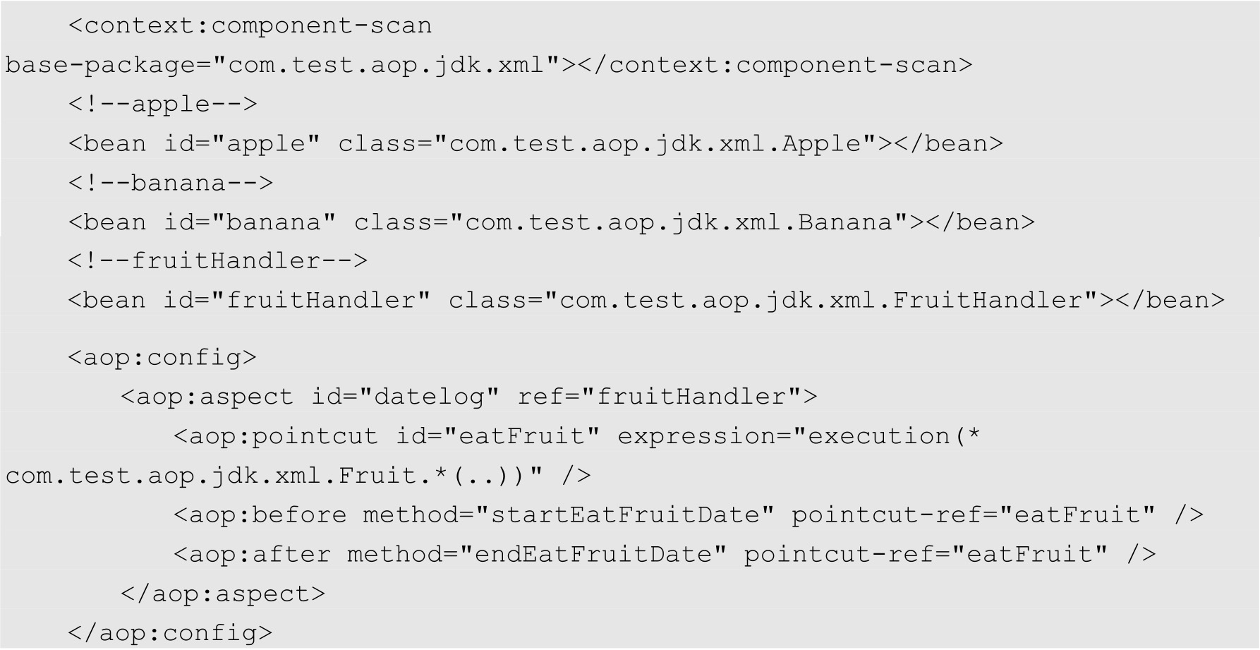 Spring AOP的一个特点是被代理的对象需要实现一个接口。下面以一个Fruit接口为例,验证基于XML配置的Spring AOP实现,Fruit接口的定义如下: