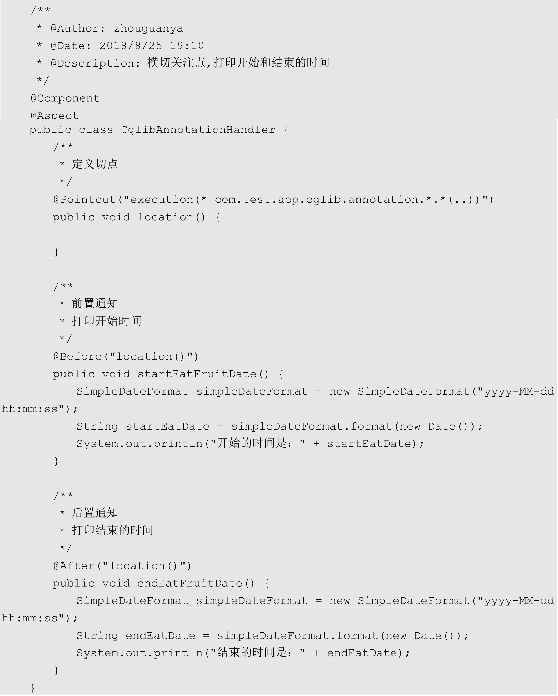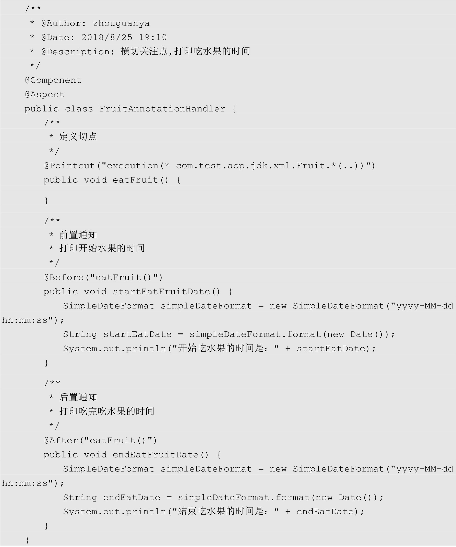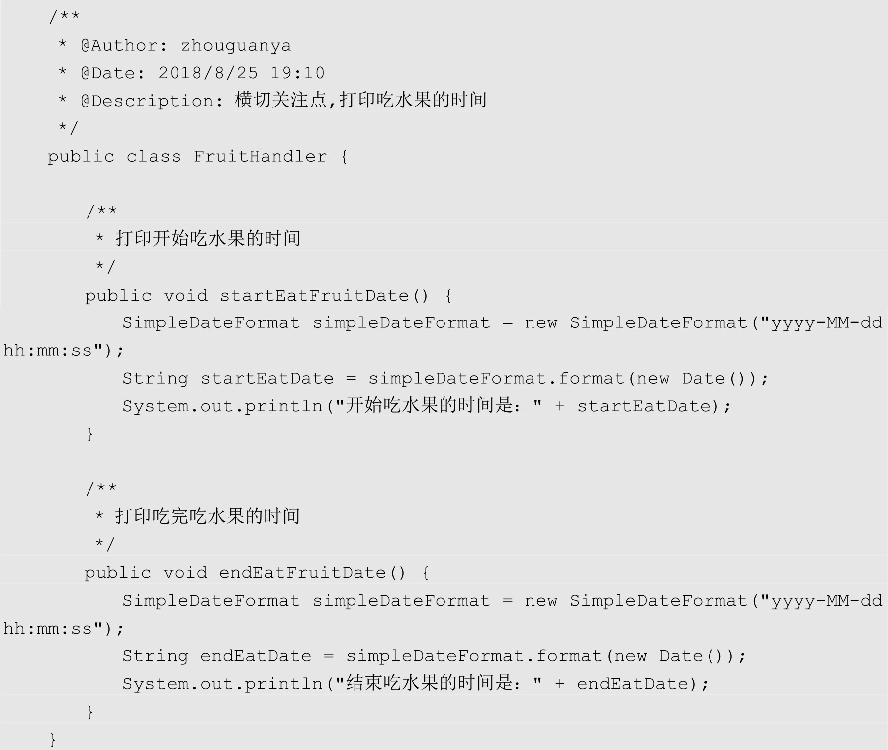 以下代码是对以上两个被代理对象加的横切关注点逻辑,横切逻辑打印吃水果的时间和水果吃完的时间: