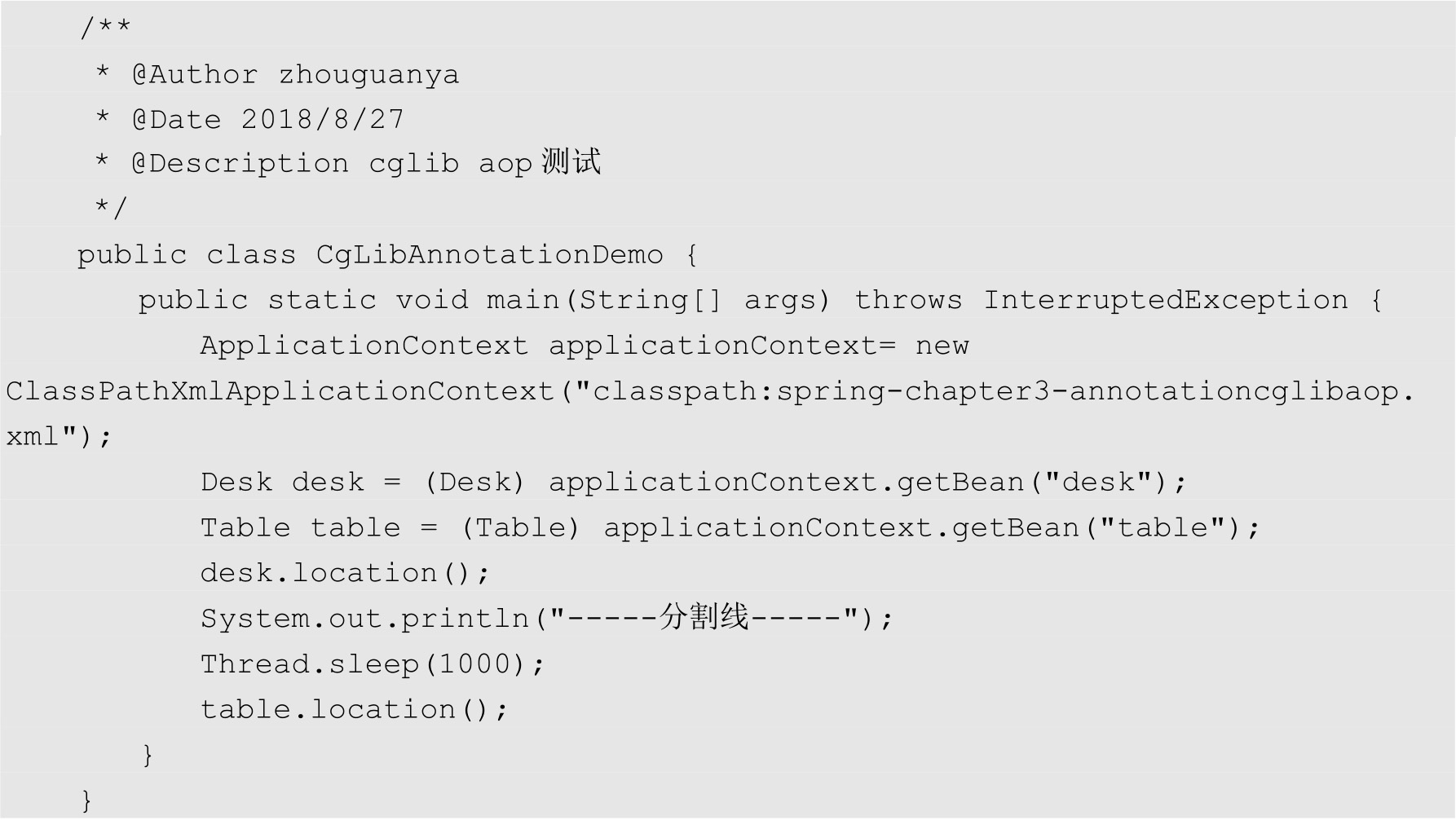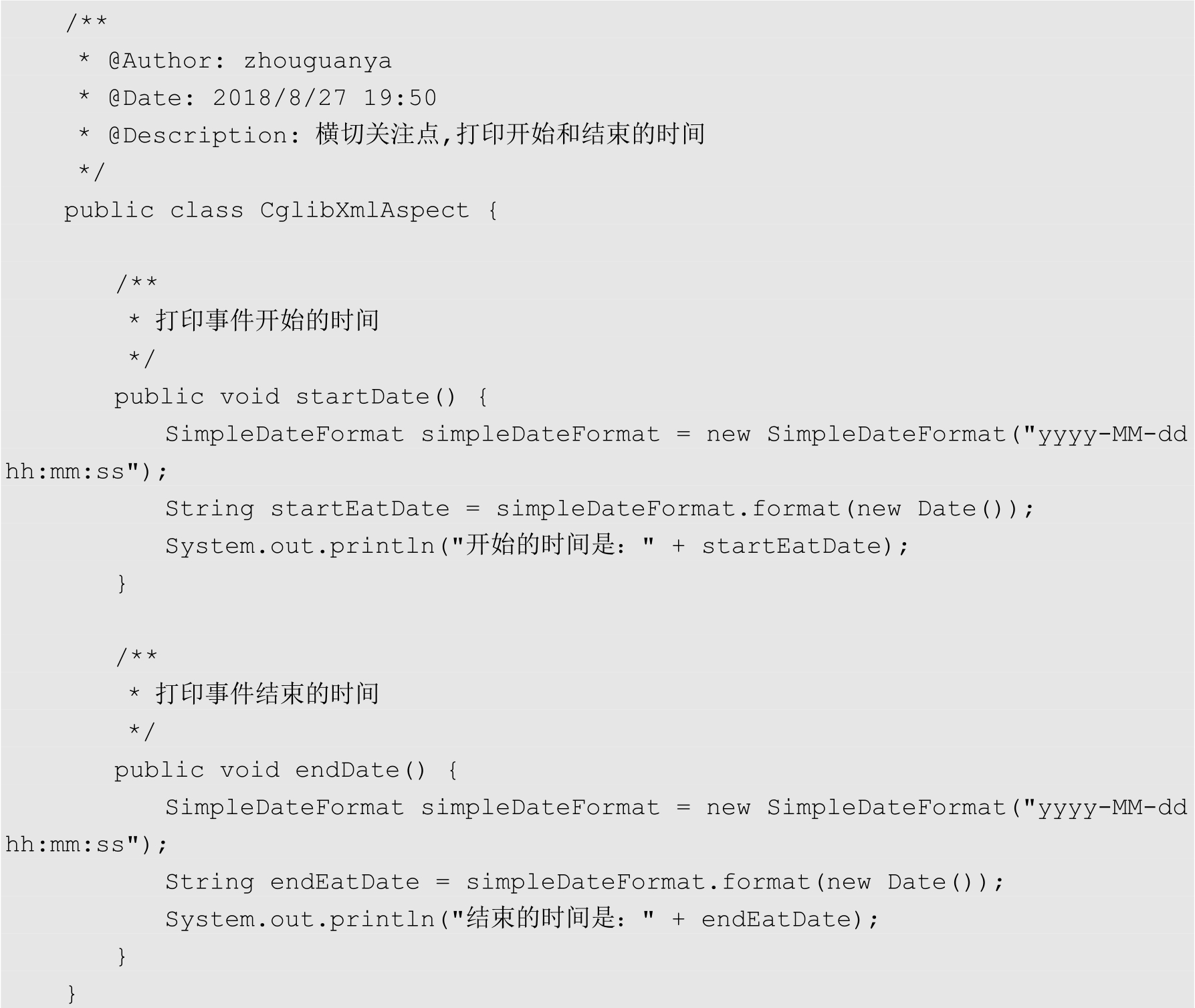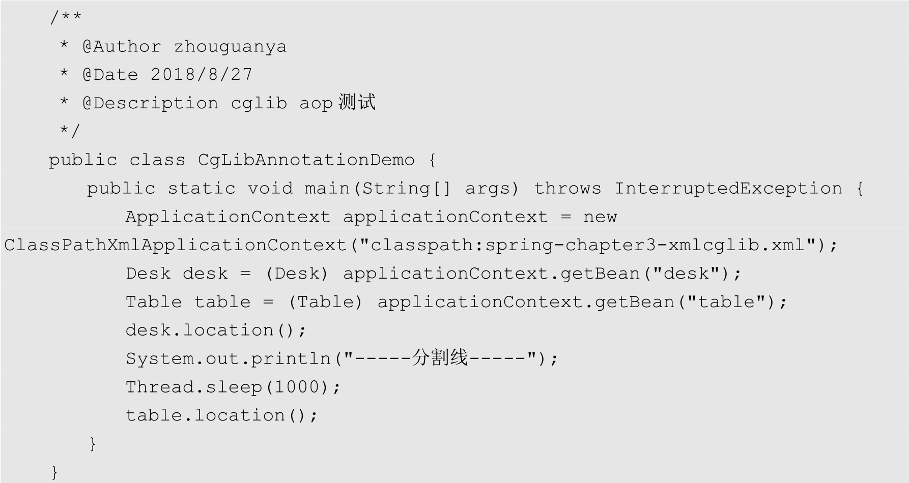 下面定义一个横切关注点CglibXmlAspect,在Desk和Table两个类前后分别打印时间,以观察两个类在执行location()方法的时间,具体代码如下: