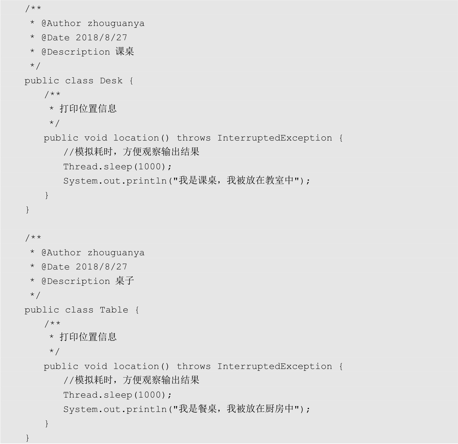 下面将以XML的形式介绍基于CGLIB的方式实现的Spring AOP,这个例子中有Desk和Table两个类,分别打印各自的位置,代码如下:
