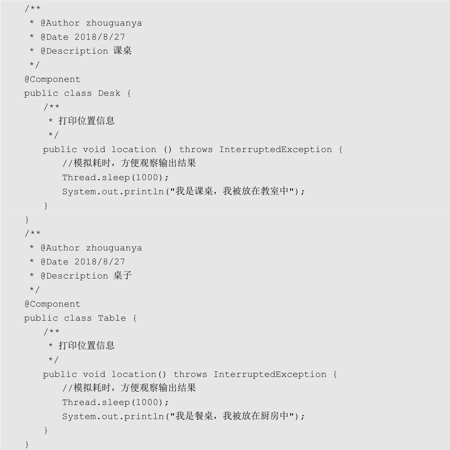 下面是用注解方式演示基于CGLIB方式实现的Spring AOP。Desk和Table分别用@Component注解修饰,代码如下: