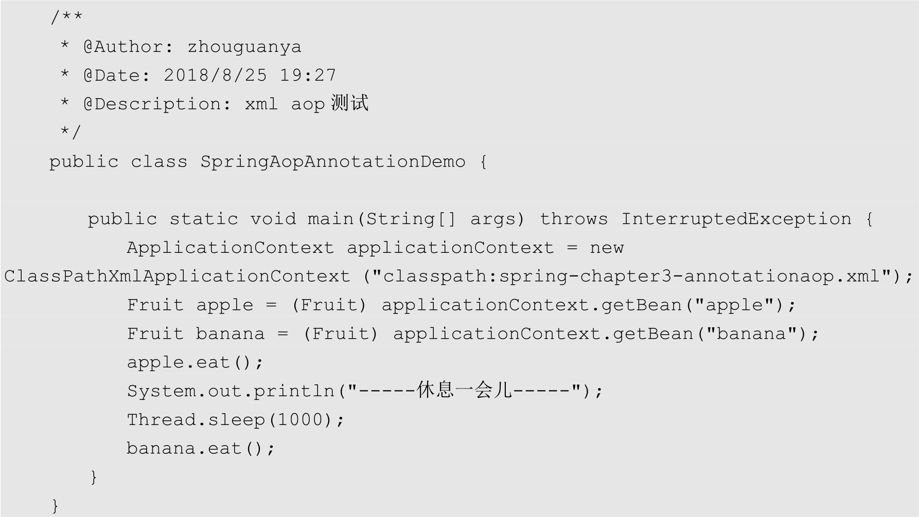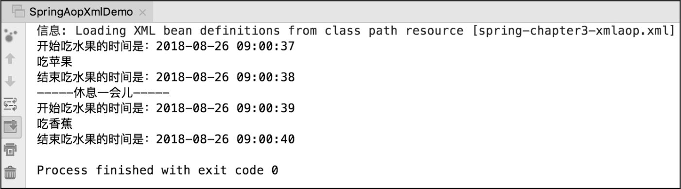 从图3-4执行结果可以发现,在没有修改Apple类和Banana类代码的情况下,每次执行eat()方法,都会输出“开始吃水果的时间”和“结束吃水果的时间”这样的日志记录逻辑,验证了Spring AOP是可以正常使用的。