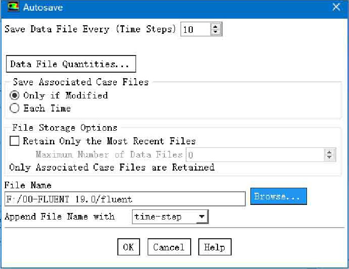在Fluent中还可以使用自动保存功能以减少人工操作。使用这项功能,可以设定文件保存频率,即每隔一定的迭代步数就自动保存算例和数据文件,菜单操作为: