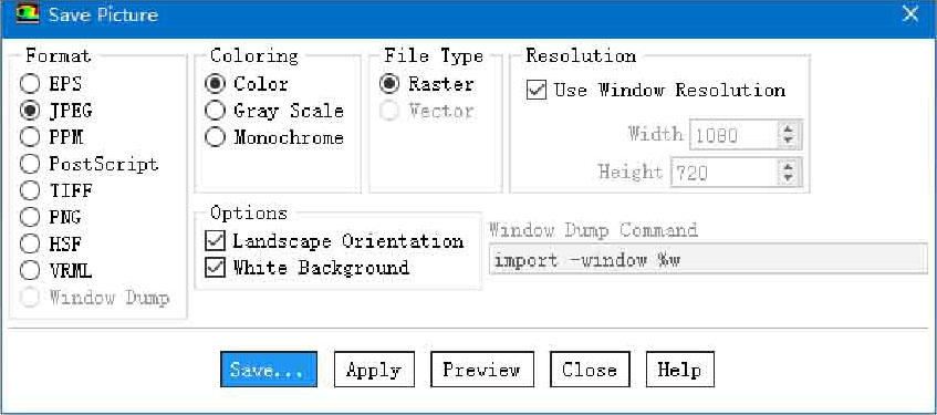 Fluent内部有一个Save Picture(保存图形)面板,在保存图像文件前,可以使用这个面板对图像文件的保存格式、颜色方案等进行设置,如图2-9所示。