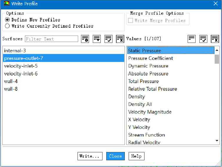 打开Write Profile(写边界函数分布)面板,如图2-8所示,选择创建新的边界文件还是覆盖原有文件,同时在Surfaces(表面)中选择要定义的边界区域,再在Values(值)中选择要指定的流场参数,单击Write(写)按钮就可以生成边界函数分布文件。