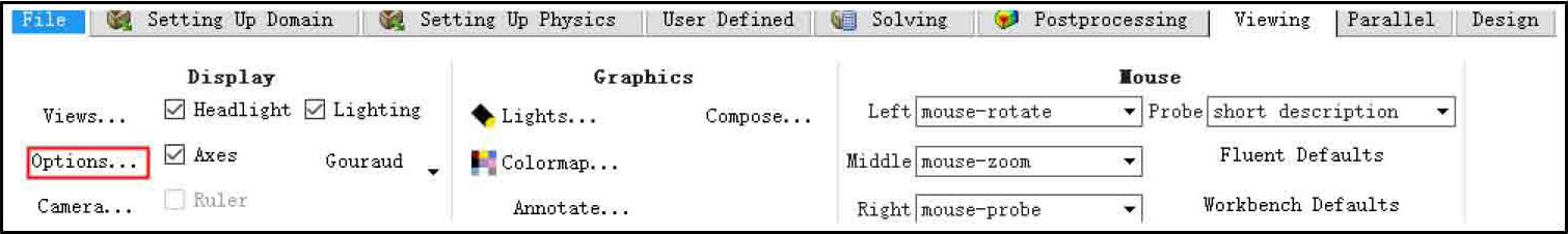 Fluent默认的图形显示界面通常是黑色或者渐变的浅蓝色背景,通过以下步骤可改变Fluent图形显示界面背景颜色。