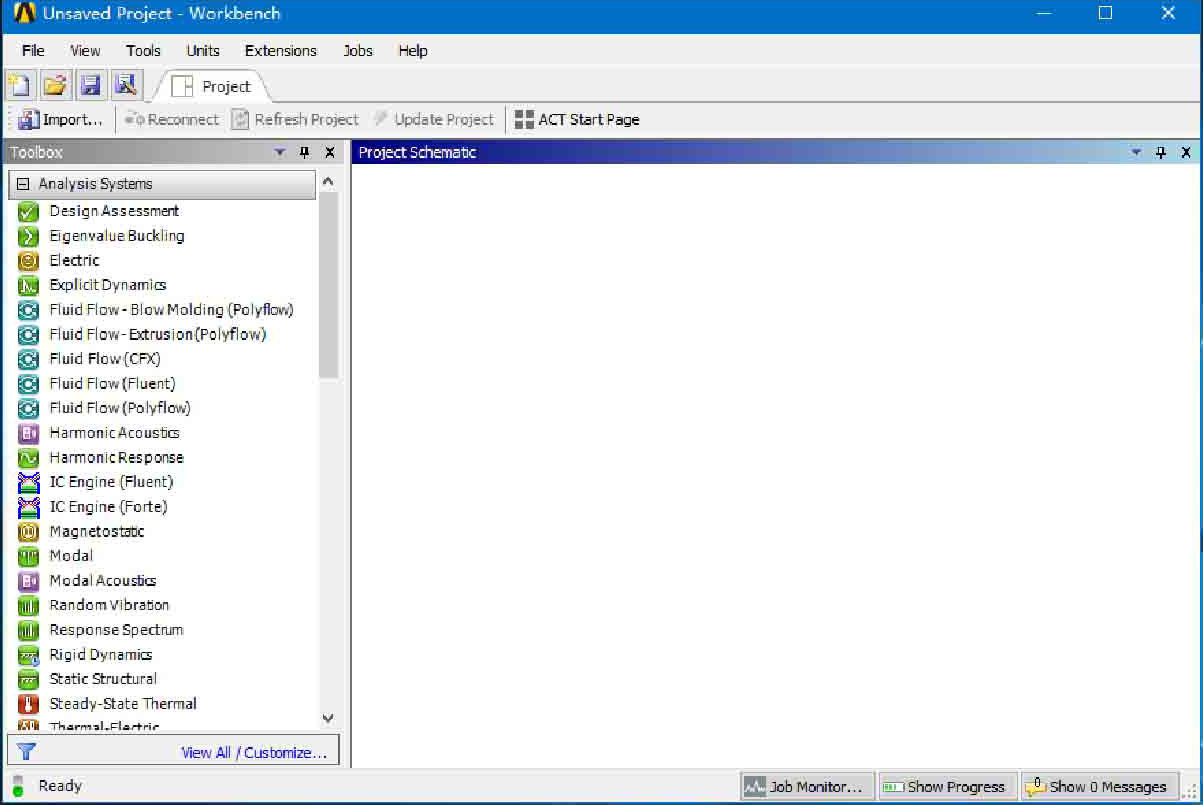 步骤01 在Windows系统下执行“开始”→“所有程序”→ANSYS 19.0→Workbench命令,启动ANSYS Workbench 19.0,进入如图2-1所示的主界面。