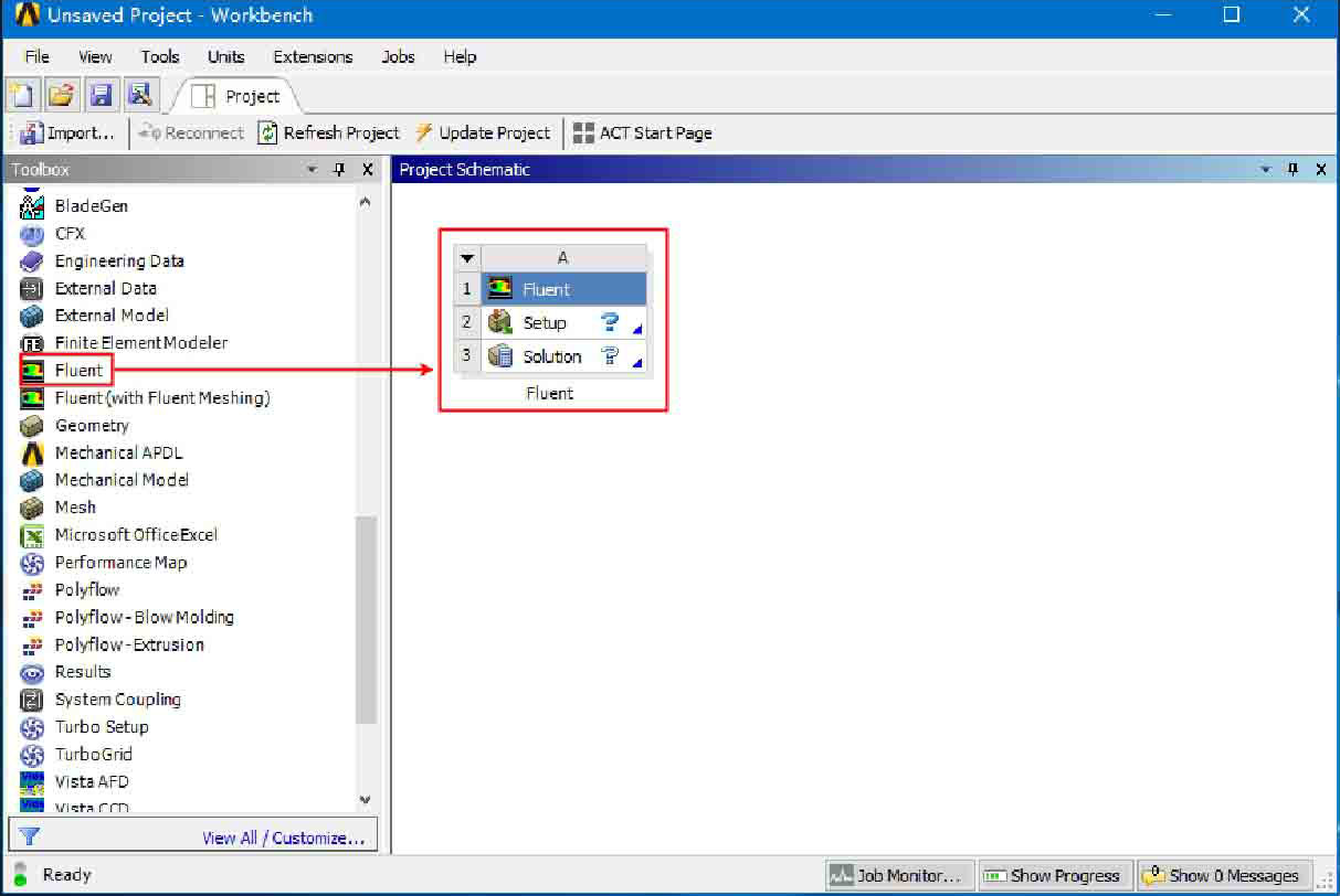 在Workbench中启动Fluent首先需要运行Workbench程序,然后导入Fluent计算模块,进入程序,步骤如下: