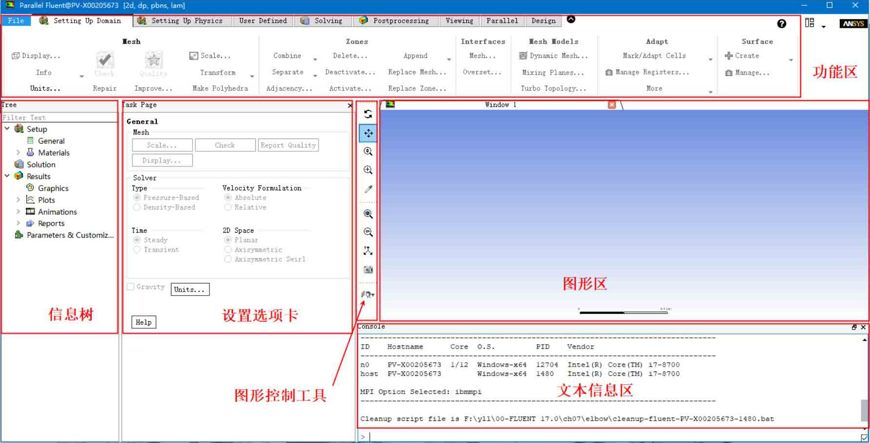 Fluent 19.0界面如图2-4所示,界面大致分为6个区域。