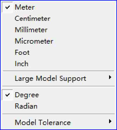 在开始进行一个新的模型设计之前,需要在Units菜单中为模型指定长度单位,如图3-11所示,供用户选择需要的长度单位(可以将其设置为默认值)。