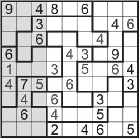 接下来再看看没有被完整包含的两个锯齿宫。这个涂色区域下,还有五个单元格没有被包含进去。而再观察包含在涂色区域内的单元格,也恰有五个单元格并不属于这三个锯齿宫。因为三个锯齿宫内也得填入数字1到9各三个,所以我们可以知道,包含在涂色区域内而不属于这三个锯齿宫的五个单元格的填数和这三个锯齿宫不在涂色区域内的五个单元格,它们的填数应当是一样的。