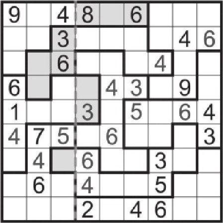 这种数独技巧观察起来就比较难了。表示割补法数独技巧的时候,以后可以直接对其进行画线。比如右边这道题,只需要在第3列和第4列之间画一条线,就可以代表割补法了。