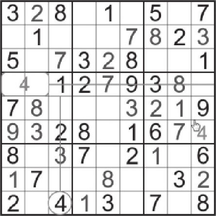 如上图所示,观察第4个宫,我们发现4只能填入D1或D2。虽然具体怎样我们确定不下来,但我们可以确定的是,D1和D2内有一个单元格一定是填4的。而它们又刚好同一行,所以D行内其余位置都不能填入4。