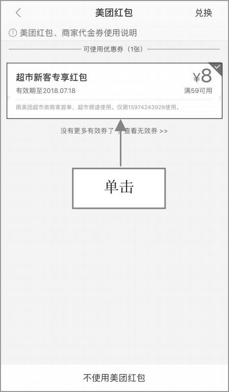 步骤05 操作完成后,页面跳转至“美团红包”界面。在该界面中选择需要使用的红包,如图2-25所示。