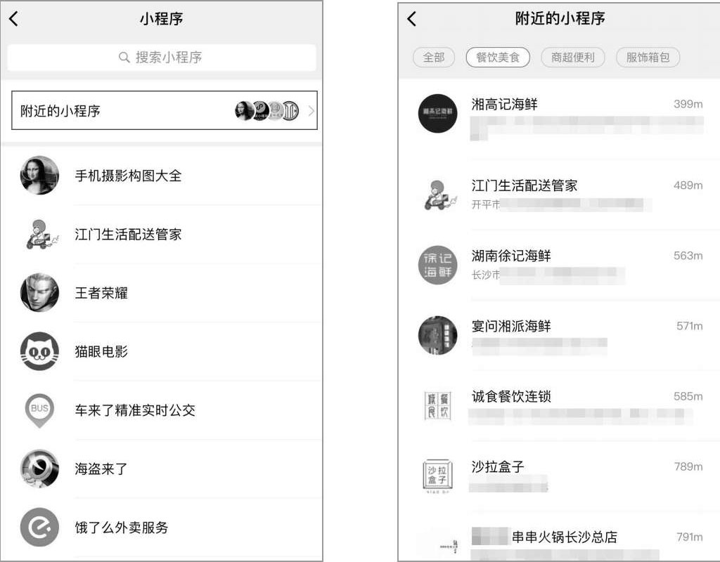 小程序专门设置了“附近的小程序”版块,只要店铺的小程序上线并开启了“附近的小程序”功能,那店铺附近的消费者便可以看到该店铺。如图2-30所示为“附近的小程序”的相关界面。