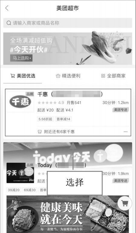 步骤02 操作完成后,进入“美团超市”界面,在该界面中选择需要消费的超市,如图2-22所示。