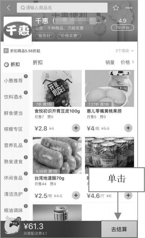 步骤03 进入超市,选择商品。因为红包是满59元可用的,所以,我们需要凑足59元,然后单击右下方的“去结算”按钮,如图2-23所示。