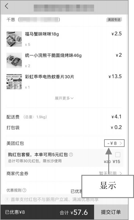 步骤06 选择完成后,页面将跳转至订单界面。可以看到,此时“美团红包”一栏,显示“−¥8”,如图2-26所示,与此同时,下方的费用也由原来的65.6元变成了57.6元,这就说明红包选择成功,只要用户提交订单便可以使用该红包了。