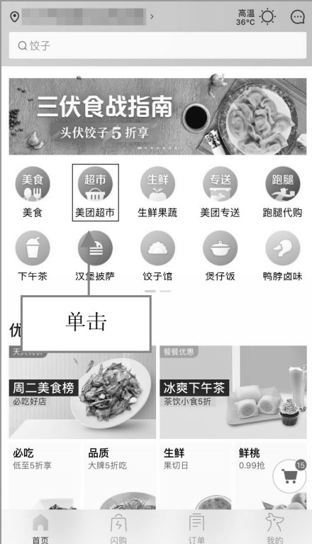 步骤01 从图2-20可以看出,该红包是“超市新客专享红包”,所以,我们要用这个红包就需要单击“美团外卖”App中的“美团超市”选项,选择正确的消费品类,如图2-21所示。